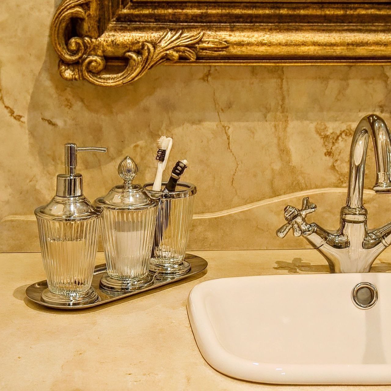 ست بهداشتی ۴ تیکه ترکیبی از استیل و کریستال بسیار شیک شامل جامسواکی جامایعی و جای اکسسوری بهمراه سینی طلایی و سیلور موجود