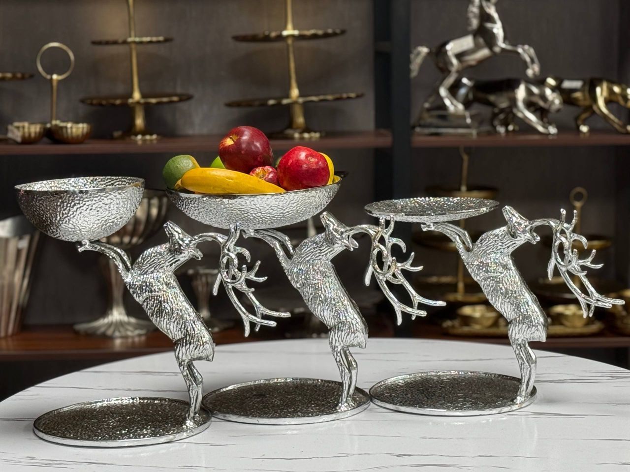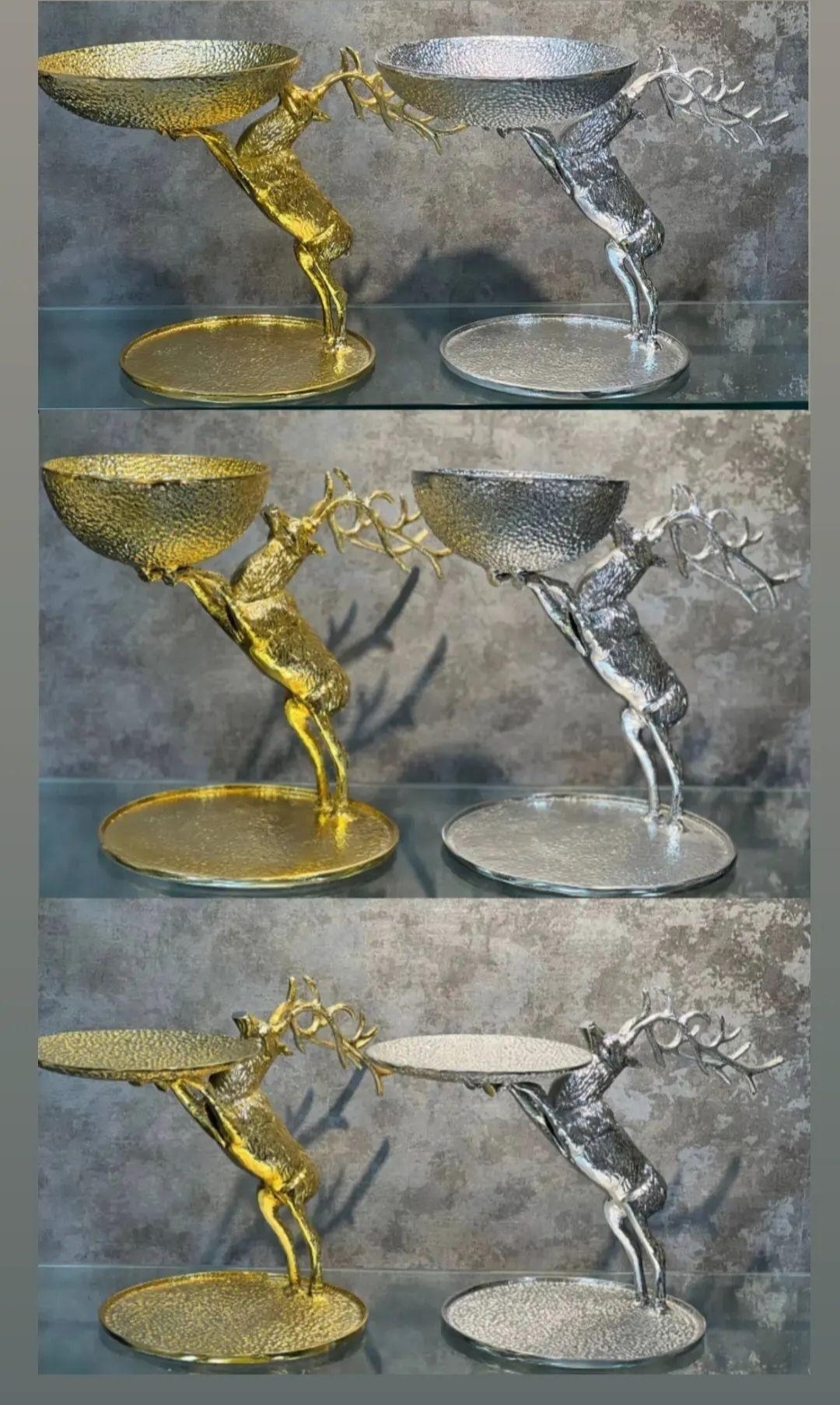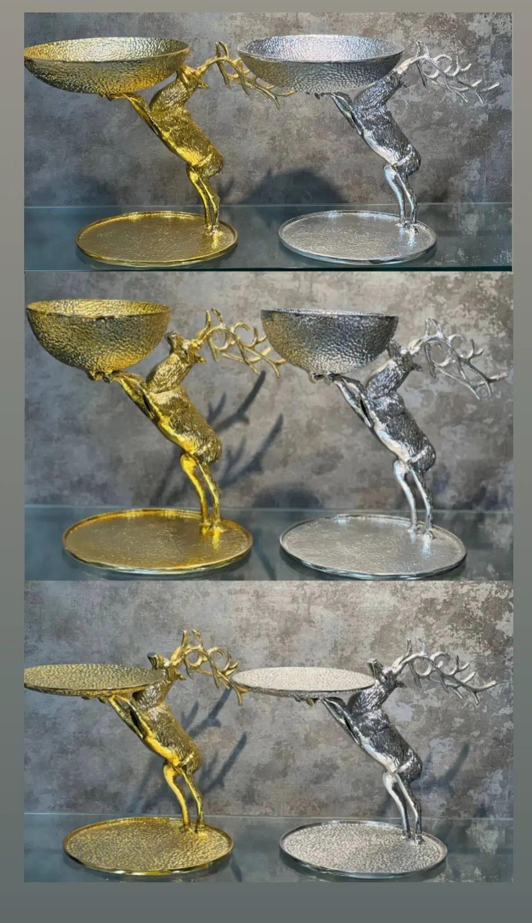 سرویس پذیرایی شامل ۳تیکه دو طبقه شیرینی خوری میوه خوری آجیل خوری رنگ ثابت طلایی و سیلور موجود متریال آلومینیوم