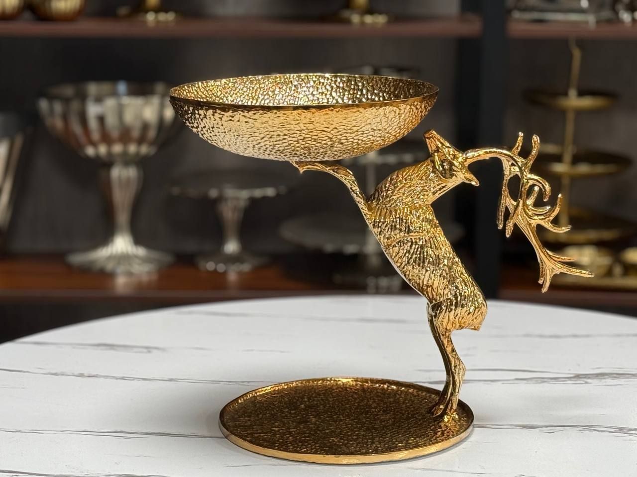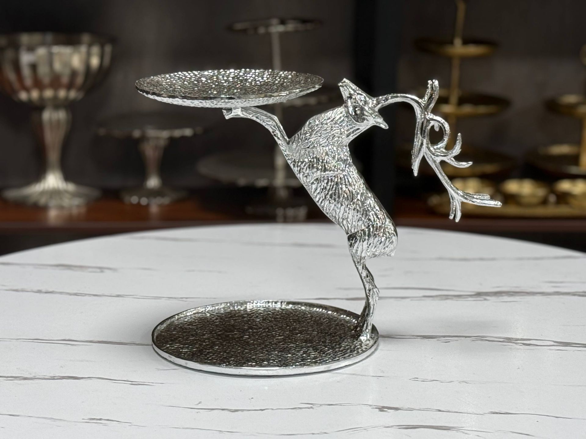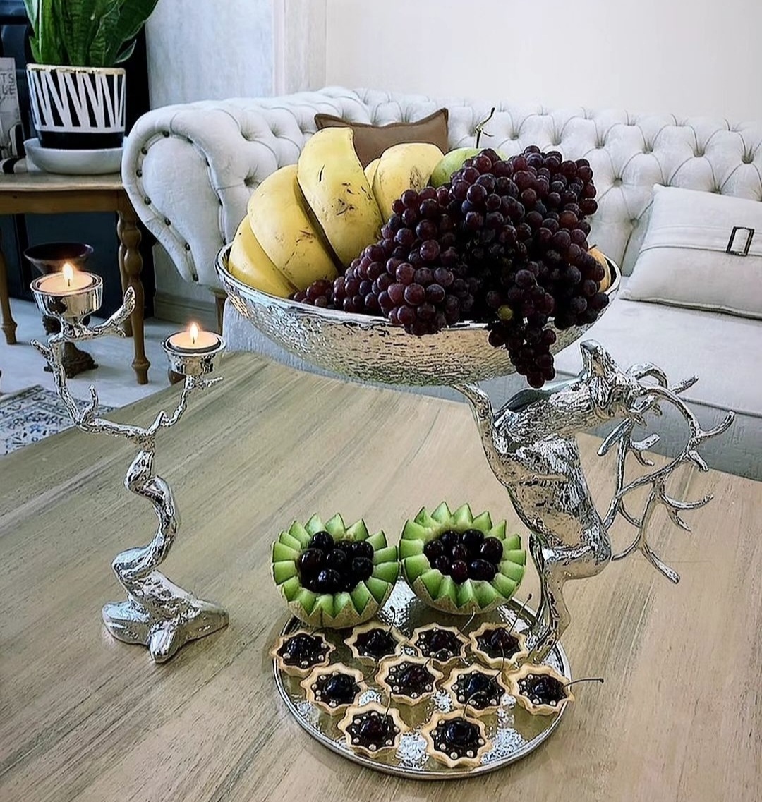 سرویس پذیرایی شامل ۳تیکه دو طبقه شیرینی خوری میوه خوری آجیل خوری رنگ ثابت طلایی و سیلور موجود متریال آلومینیوم